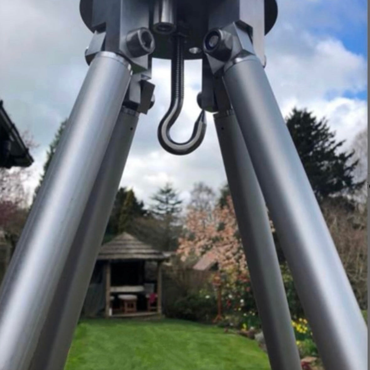 Our CB Quadpod has been designed for weighing the heaviest Cats and has four legs for maximum support. Four stout 1.8m adjustable legs extending to 2.1m for levelling on rough ground. The Quadpod gives more room than conventional tripods as it has a wide area between the legs for the fish without banging the poles. The legs are fitted with pivoting flat feet with holes for locking down pegs. A quality stainless steel top plate with 4 adjustable knuckle joints. Tested to lift 200lbs plus (scales not included).